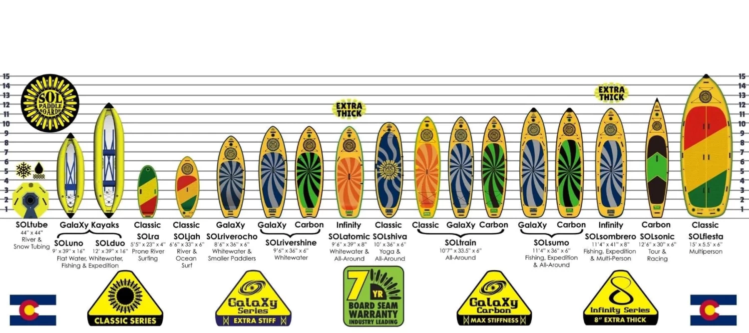 The SOLtrain GalaXy inflatable SUP is a great all-around versatile board. You can literally take this paddle board wherever, whenever whether it is lake cruising, ocean exploring, river running, fishing, yoga or carrying a small front passenger.